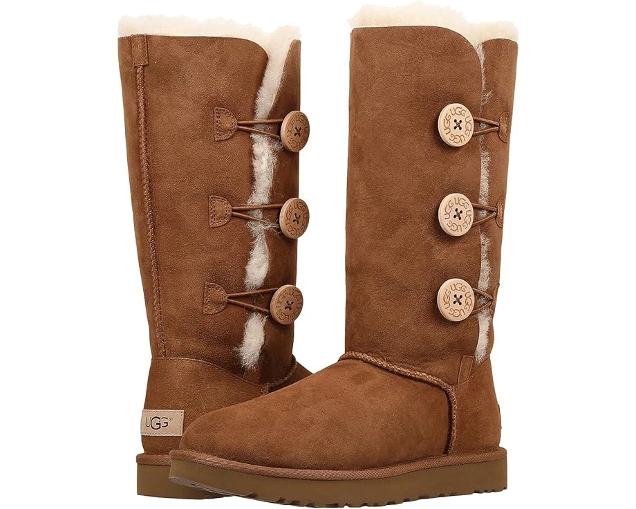 The Bailey Button Triplet II runs large and is available in whole sizes. Please order one size down from your normal size. If a half size, please order only 1/2 size down.SKU: #8727091Please be advised, boots are not made for snow and ice or heavy walking.The adorable Bailey Button Triplet II is a must-have addition to your UGG® boot collection.Twin faced sheepskin uppers with suede heel guards for added structure.The Bailey Button Triplet II is now water resistant and stain resistant. Boot cuff can be worn up or folded over depending on style preference. Wooden button and elastic band closure for easier on and off wearability. Fully lined in luxurious, UGGpure™ wool. It’s a luxurious, natural wool woven into a durable backing that enhances the overall product experience. UGGpure delivers a plush sensory experience with every wear.Generously cushioned footbed is lined in UGGpure™ wool for breathability and warmth.New Treadlite by UGG™ outsole provides increased traction, durability, cushioning and flexibility. Slight dye transfer may occur with darker colored sheepskin during first few wears.Care and Cleaning InstructionsThis product contains real fur from Sheep or Lamb.