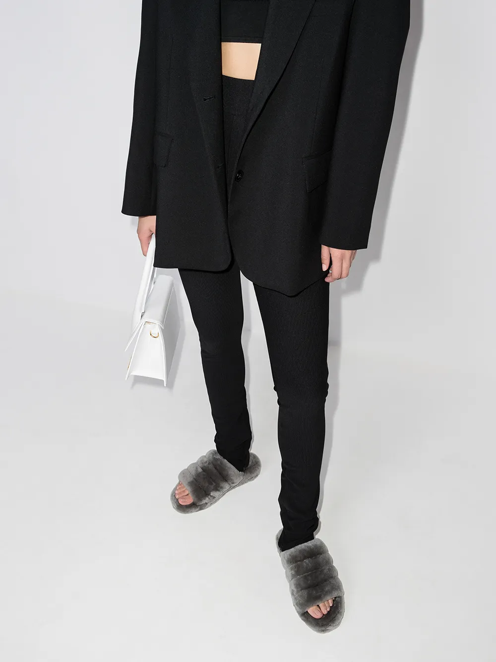 Soft charcoal shearling wraps the foot in this pair of Fluff Yeah slides from UGG. Constructed with a slingback strap, these shoes keep the wearer’s feet covered in comfort.