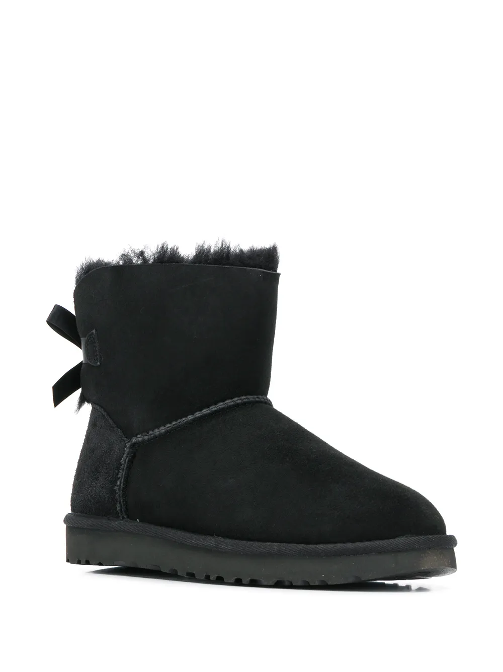 Black suede Mini Bailey Bow boots from UGG featuring a flat heel, a slip-on style, a shearling lining and a bow detail.